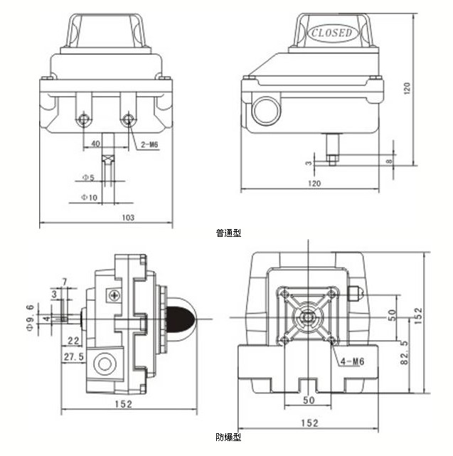 防爆标志:ExdⅡBT4 防 护:防水IP 67/NEMA4 &4X,IP68 环 境: -20oC∼80℃接 线:2×NPT1/2,PF 1/2",PT ",M20,PG13.5 端 子:8 PoINTS(0.08-2.5mm2) 位置指示:关:红,开:黄 开 关: 机械开关switch×2,接近开关sensor×2 外部涂层:聚酯涂层(黑或其它) 转 轴: 标准轴(17mm),加长轴 旋转角度:0°∼ 90°角行程 0°∼ 180°(可调) 直线行程:10∼ 100mm(直行程) 机械式限位开关 机械开关:(2SPDT)APL-210N 标准防护:IP67,可选IP68 标准开关:SS5GL(OMRON) 2SPDT开关(选项:SPST-NC,SPST-NO) 触 点:250VAC/3A,125VAC/5A 250VDC/O.2A,125VDC/O.4A,30VDC/4A 选 项:SS10GL(OMRON) 2SPDT开关(选项:SPST-NC,SPST-NO) 触 点:250VAC/10.1A,125VAC/1O.1A 250VDC/O.2A,125VDC/O.4A,30VDC/4A. 行程开的主要外形图