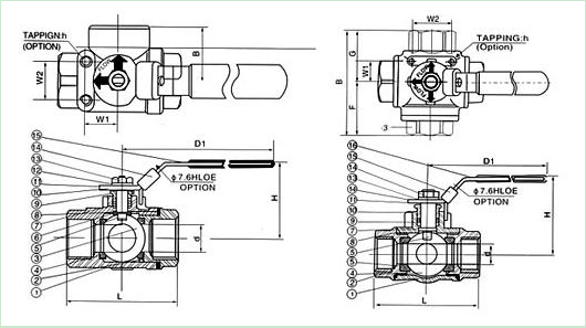 三通螺纹球阀L型主要尺寸: SIZE | d | L | H | D1 | B | W1 | W2 | 1/2″ | 12.7 | 64 | 53 | 97 | 32 | 22.4 | 35 | 3/4″ | 16 | 76 | 63 | 126 | 38 | 22.4 | 35 | 1″ | 20 | 87 | 66 | 126 | 43.5 | 22.4 | 35 | 11/4″ | 25 | 96 | 81 | 145 | 48 | 22.4 | 35 | 11/2″ | 32 | 114 | 83 | 145 | 57 | 25.4 | 38.1 | 2″ | 38.1 | 142 | 96 | 204 | 71 | 25.4 | 38.1 |