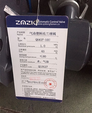 塑料法兰气动球阀的材质也是有UPVC、CPVC材质,客户可根据自己的需要选择材质。如下图是这位客户做的这台塑料气动法兰球阀的合格证,上面标明了球阀的一些常见参数。 ![]() 塑料气动法兰球阀和其它的气动球阀一样,可以配电磁阀、限位开关、三联件等附件。这些附件如果现场有配的话就不用再配了,如果现场没有我们建议客户配上这些附件,虽然这些附件价格不贵,几十块钱,但是起到的作用很大。 ![]() 这次客户订购的这台塑料气动法兰球阀已经做好,今天就可以发货了,预计3到4天可以到达客户那里。 本文关键词:塑料气动法兰球阀 |