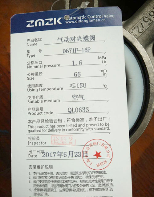 我们这位北京的客户说他们以前都是在天津那边订的气动对夹蝶阀,比较近而且快递也很快,但是用着效果不怎么好,所以这次在我们这订一台先试试看,要是好用后面再长期合作。 ![]() 上面的合格证是这次发货的气动对夹蝶阀,从合格证上我们可以看出这台气动对夹蝶阀的基本参数,从型号D671F-16P上我们可以看出这台气动对夹蝶阀配的密封圈是四氟的,有点耐腐蚀,阀体是不锈钢的。产品编号也在上面标着,如果以后有什么问题,可以凭这个产品编号很快的找到当时的具体信息。 ![]() 虽然只有一台气动对夹蝶阀,但我们还是会很认真的包装发货,这台气动对夹蝶阀已经打压测试好,今天下午就可以发货了。也请贵公司的相关负责收货人最近留意快递信息及时签收。 本文关键词:气动对夹蝶阀 |