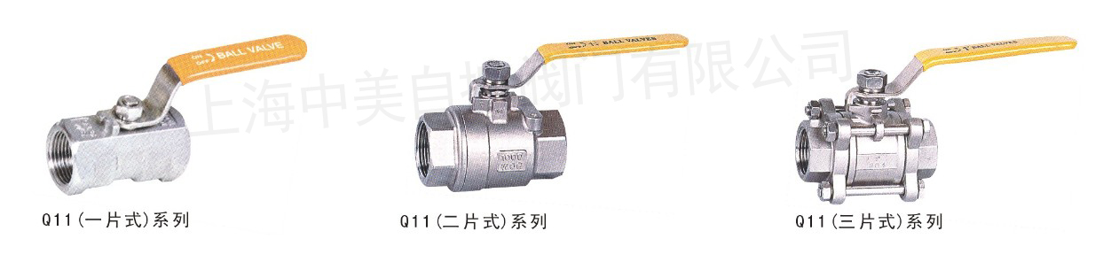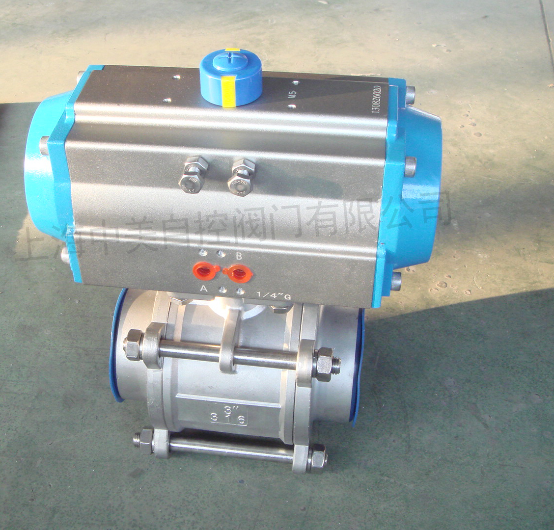 由上图可以看出,一片式球阀,二片式球阀,三片式球阀根本的区别在阀体结构上。一片式球阀是由一个塞头将球体固定。二片式球阀是由两片阀体夹住球体固定的,维修相对复杂,中间的螺丝松紧度很关键,关系到是否漏气。三片式球阀跟二片式球阀类似,但球体中间多了一个阀体,再由两边带颈法兰夹住,相对于二片式球阀,三片式球阀更易于拆卸,有利于维修。三片式球阀可以在阀体上面装个气动执行器,变成三片式气动球阀,自动控制阀门的开或关。三片式球阀如下图: