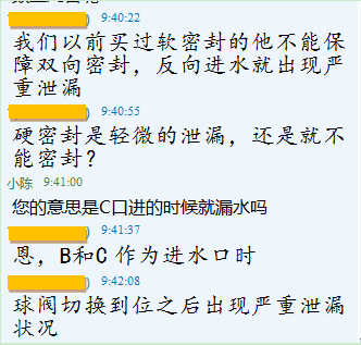 以上是客户提出的疑问和阀门的技术要求,根据客户的要求,我和技术部沟通找到了问题的原因。客户原来在其他厂家买的电动三通球阀,在调试阶段还没正式投入使用就出现泄漏,是因为之前所选的是常规的L型三通球阀只有两个密封面,从工矿图和技术要求中可以看出,进水口B的压力始终都是3.3MPA,而C口和A口是没有什么压力的,这样阀门出厂打压的时候是没有问题,但只要多切换几次,一边压力高一边没压力,压力高的那密封圈承受不了就会损坏并且把球心往压力低的那端顶,这样就造成泄漏了。如果要实现这种技术要求,密封面要做四密封,球芯要用固定式的,这样就可以解决泄漏问题而且也增加了阀门的使用寿命。 顾客是最好的老师,同行是最好的榜样,市场是最好的学堂,只有不断的学习,结合实际,根据客户的要求研发新产品,不断创新,从专业到极致,上海中美必将成为中国阀门行业的一流品牌。 2、添加朋友→搜号码→“zmzkfm”→添加关注