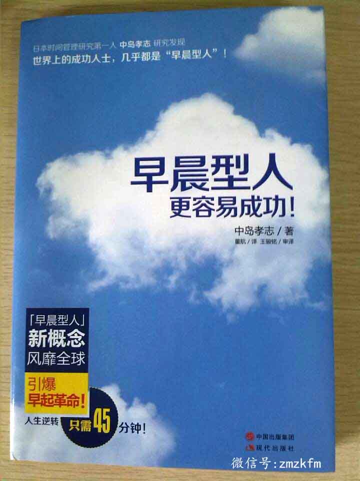 通过读早晨型人更容易成功,这本书,我学到了很多,就像书中说到世界上的成功人士,几乎都是早晨型人,没错,我们很难看到一个天天睡到日上三竿的人,却成功了。书中都是一段段简短却又真实的故事,虽然没有多么华丽的语言,却能够震撼人的心灵。最让我印象的就是,书中说到巧妙利用早晨时间的学习法没有什么时间是比在早上学习更加有效果了。 学生时代的时候,因为学校离家比较远,所以要很早起床,做40分钟地铁去学校,上地铁的时候才6点10分,车厢里面基本上没有什么人,这时候我都会拿出课文来背,虽然只有简短的40分钟,但确能够将一篇长的文言文轻松的记忆下来,我认为,早晨是一天中记忆力最旺盛的时候。 来到上海中美之后,我们每天都会有早会,阅读书籍,可能有些人觉得不理解,你们只是卖气动球阀,气动蝶阀的,为什么每天都要在读书呢?我想说的是,我们不单单是做推销员,而要做一个上知天文下知地理的优秀推销员,连孙中山都说过我一生的嗜好,除了革命之外,就是读书。我一天不读书,就不能够生活。所以我们更加要去读书了。而且通过早晨读书,我们对一天都充满了精神,更加有效率的完成工作,我想这就是书中所说的为什么早晨型人能做好工作的原因了。 HOLD早晨,HOLD成功! 2、添加朋友→搜号码→“zmzkfm”→添加关注
